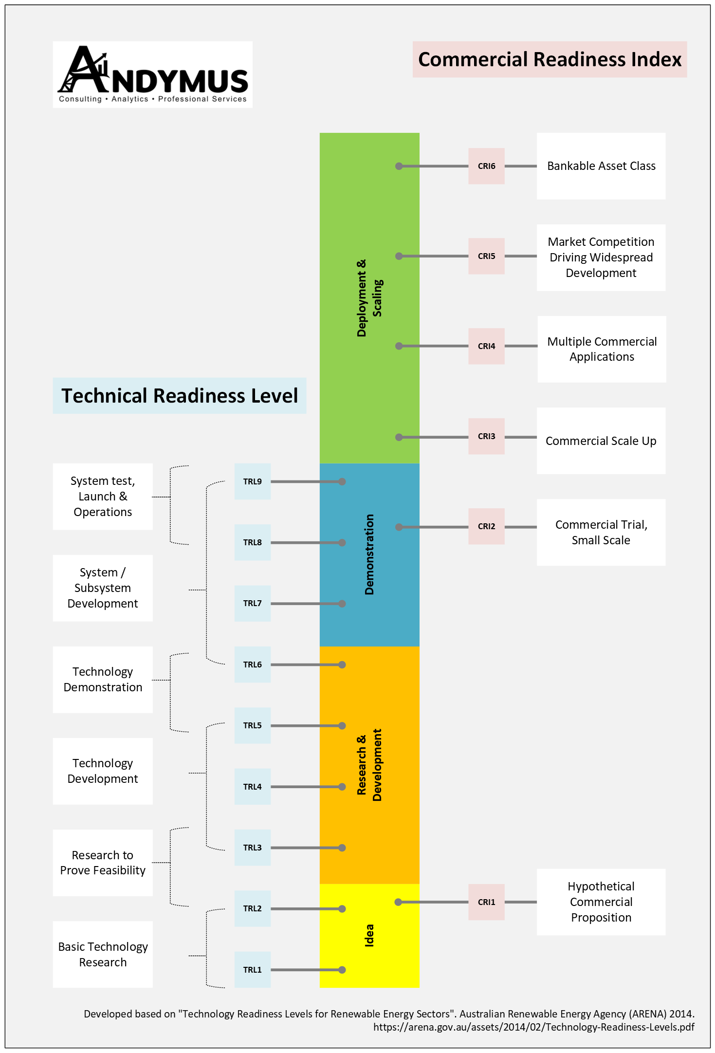 In Australia, the Australian Renewable Energy Agency (ARENA) has developed a guide to assess the readiness of renweable energy projects. There are many adaptions and visualisations of the technical readiness and comercialisation available, but here is my adaption of this information, mainly from the ARENA guide mentioned.